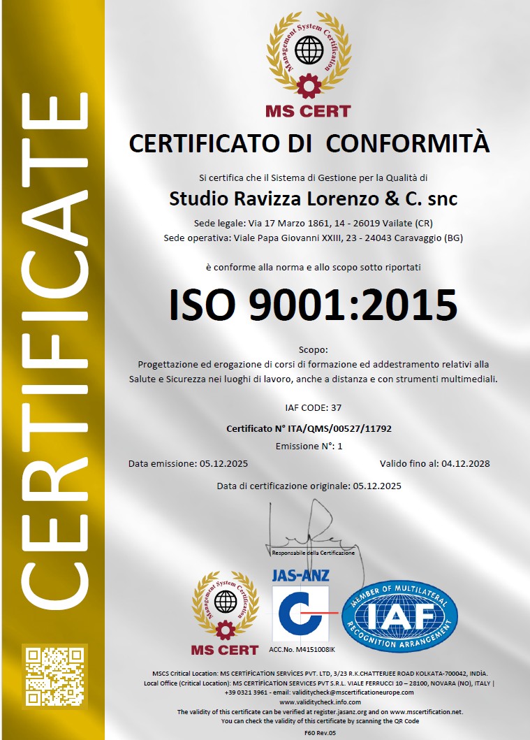La nostra azienda è certificata ISO 9001 per le attività di Progettazione ed erogazione di corsi di formazione ed addestramento relativi alla Salute e Sicurezza nei luoghi di lavoro, anche a distanza e con strumenti multimediali, a garanzia di un sistema di gestione della qualità orientato al miglioramento continuo, all’efficienza dei processi e alla piena soddisfazione del cliente.